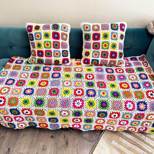 Handmade Crochet Granny Square Throw Blanket: Colorful Sofa Decor