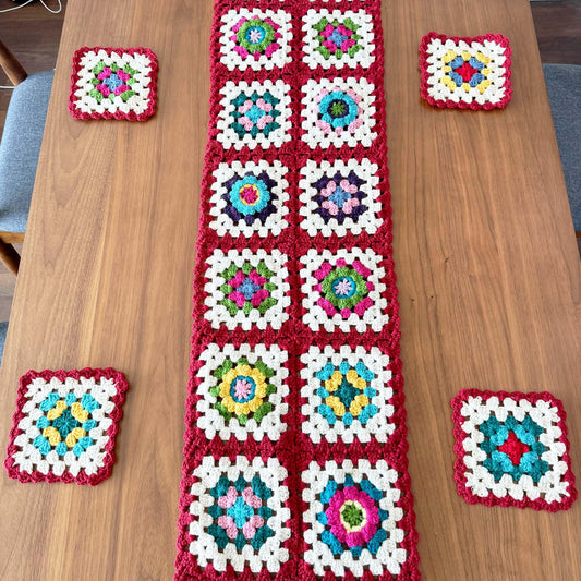 Handmade Crochet Granny Square Table Runner with 4 Coasters: Cottagecore Decor