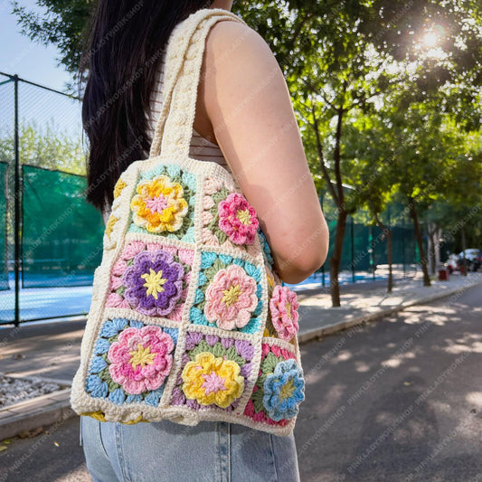 Pre-order Crochet Flower Tote Bag | Granny Square Boho Purse | Handmade Colorful Floral Bag | Retro Crochet Shoulder Bag