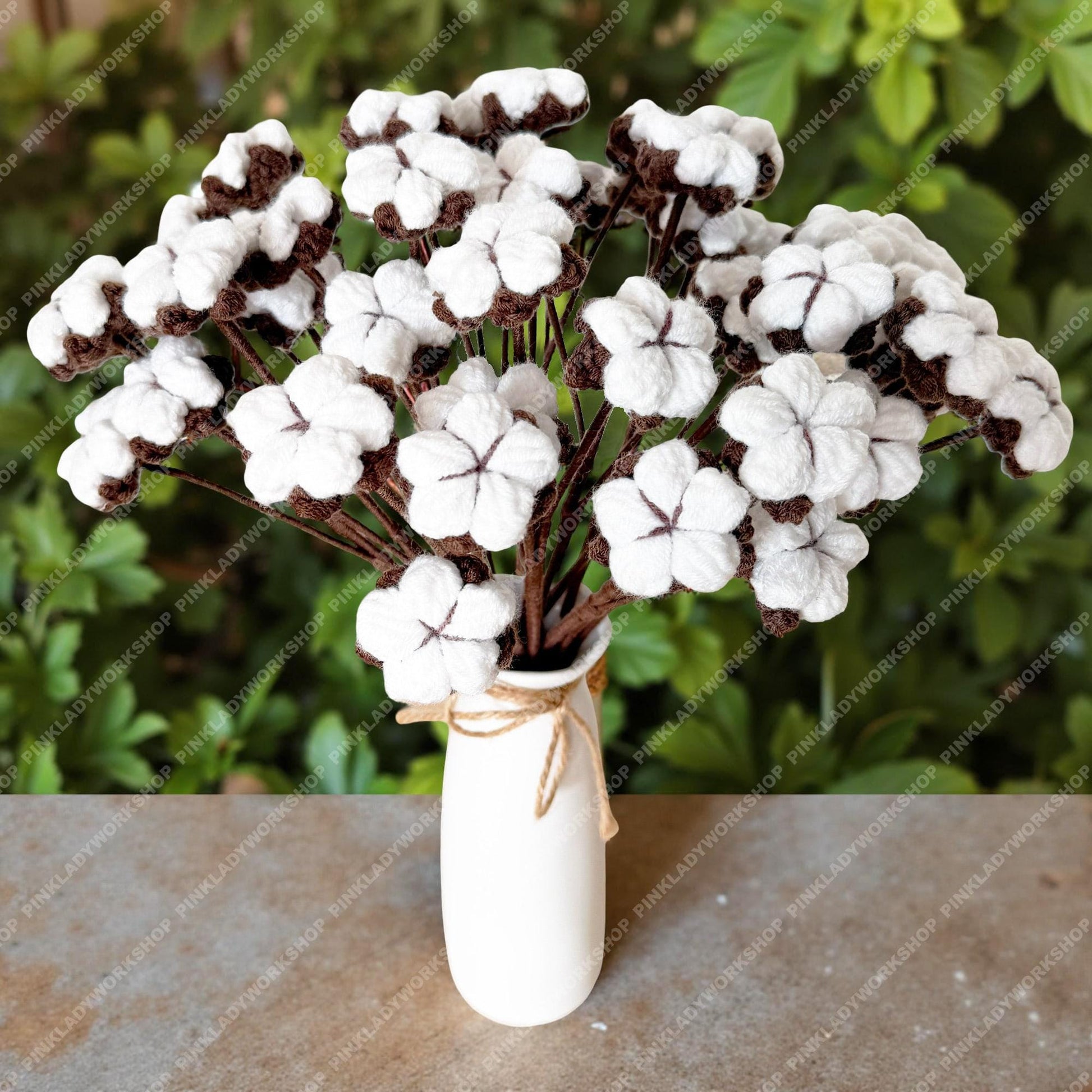 This bouquet is perfect for neutral home décor, rustic farmhouse styling, weddings, shelf displays, or as a thoughtful handmade gift. Unlike real cotton stems, these crochet flowers never shed, never wilt, and stay beautiful year-round.