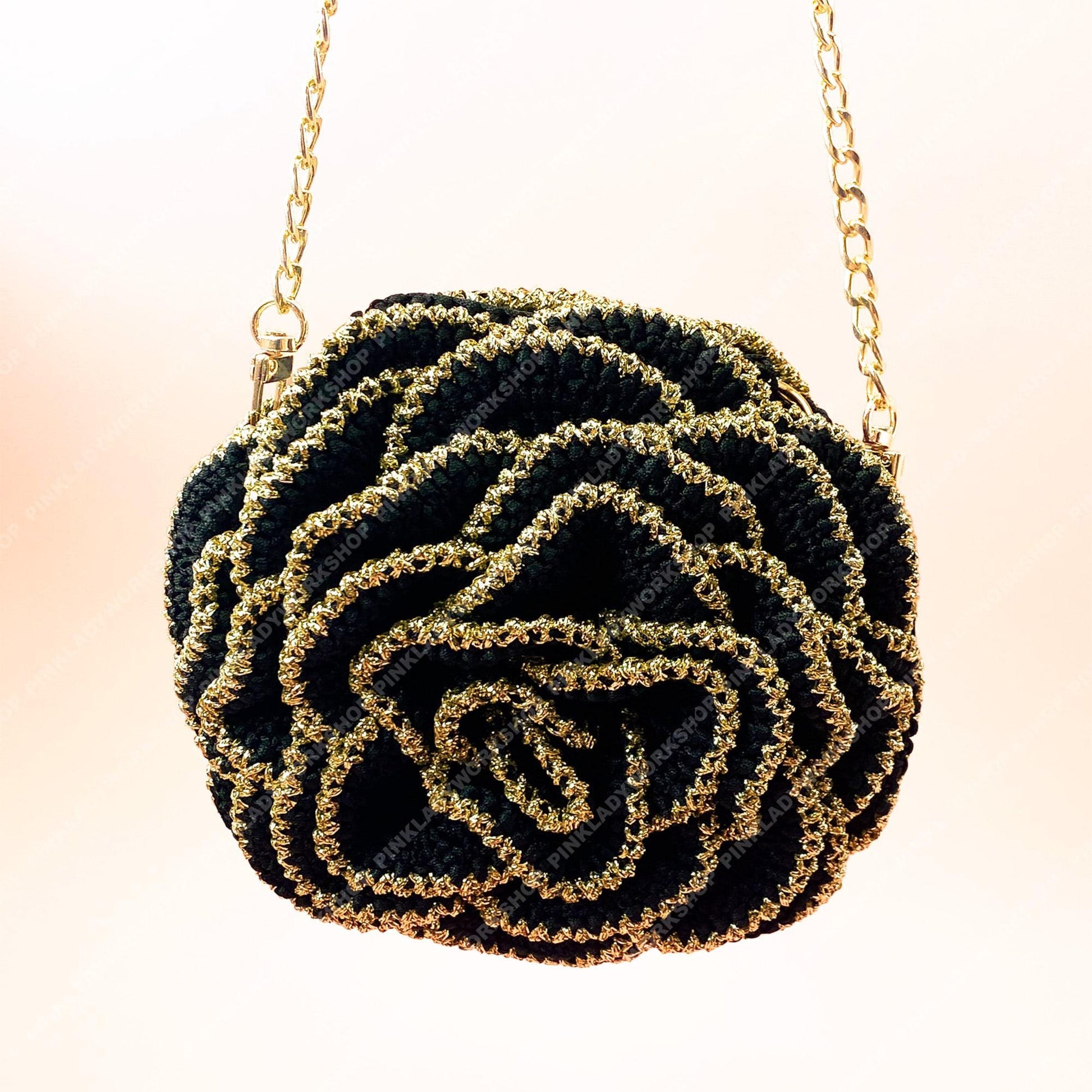 Crochet Rose Evening Bag | Handmade Black & Gold Floral Purse