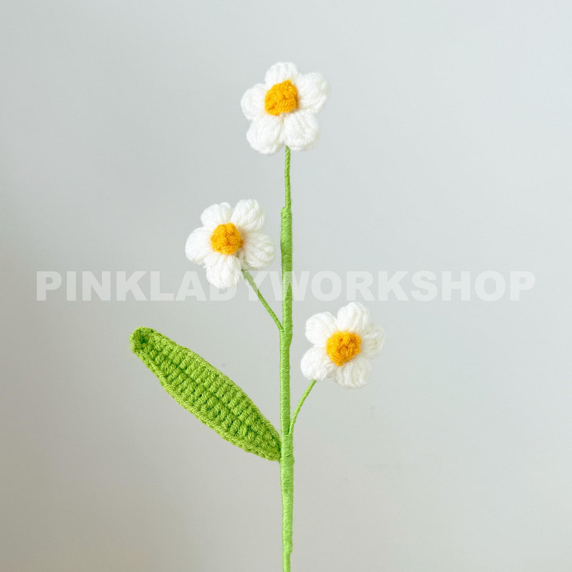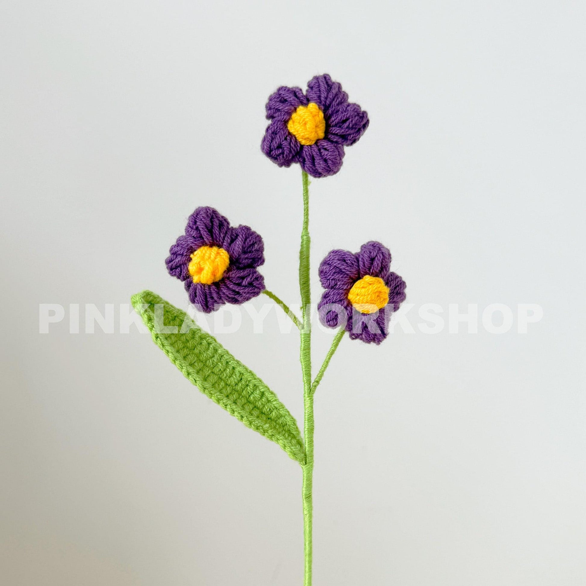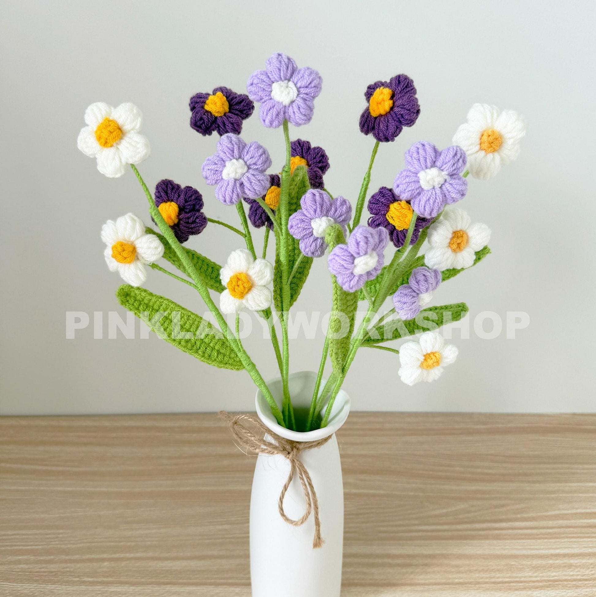 This crochet puff flower bouquet brings soft texture and cheerful charm to your space. Featuring white, lavender, and dark purple puff stitch blooms with sunny yellow centers, each stem is handmade and arranged in a minimalist ceramic-style vase, tied with twine for a rustic touch.