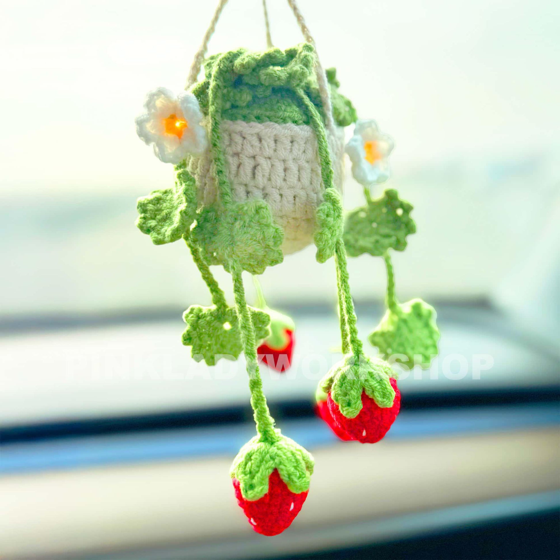 Crochet Strawberry Car Charm: Handmade Hanging Car Accessory