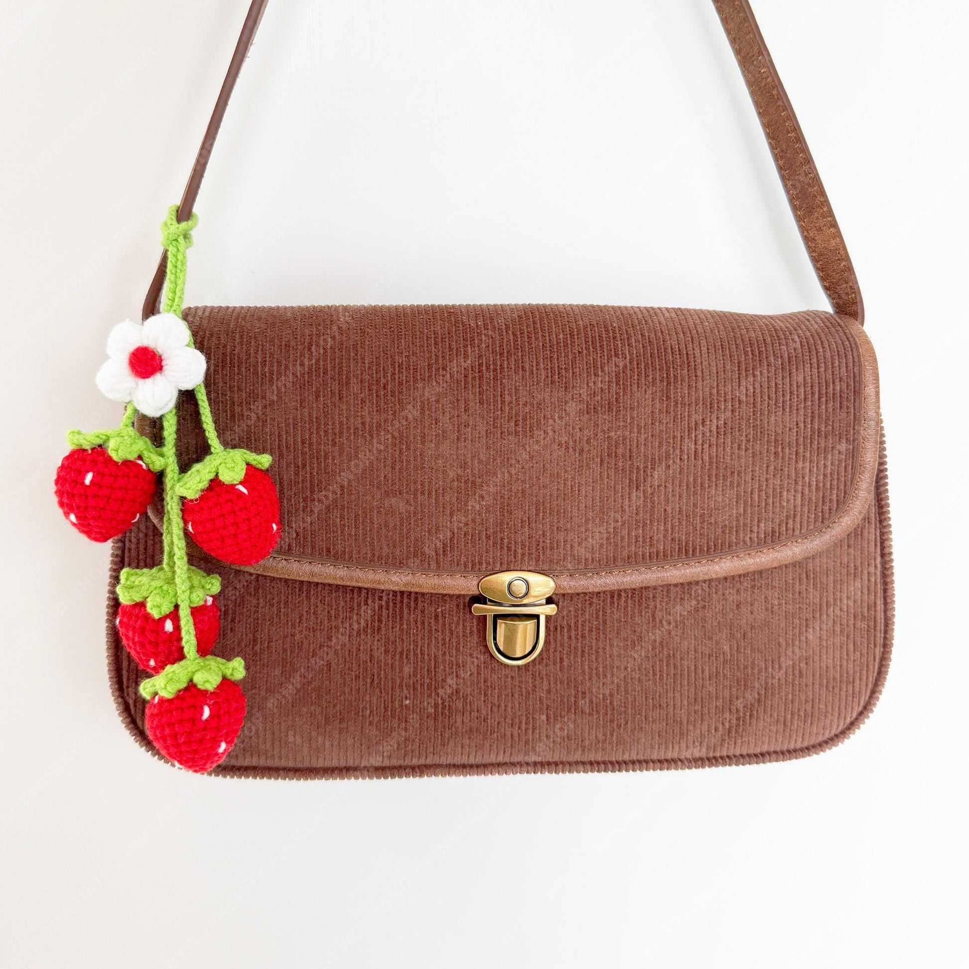 Each piece is handcrafted with soft cotton yarn, detailed with tiny seeds and bright green leaves. Lightweight yet durable, it's perfect as a bag charm, car accessory, or handmade gift for strawberry lovers and anyone who adores cute fruit décor.