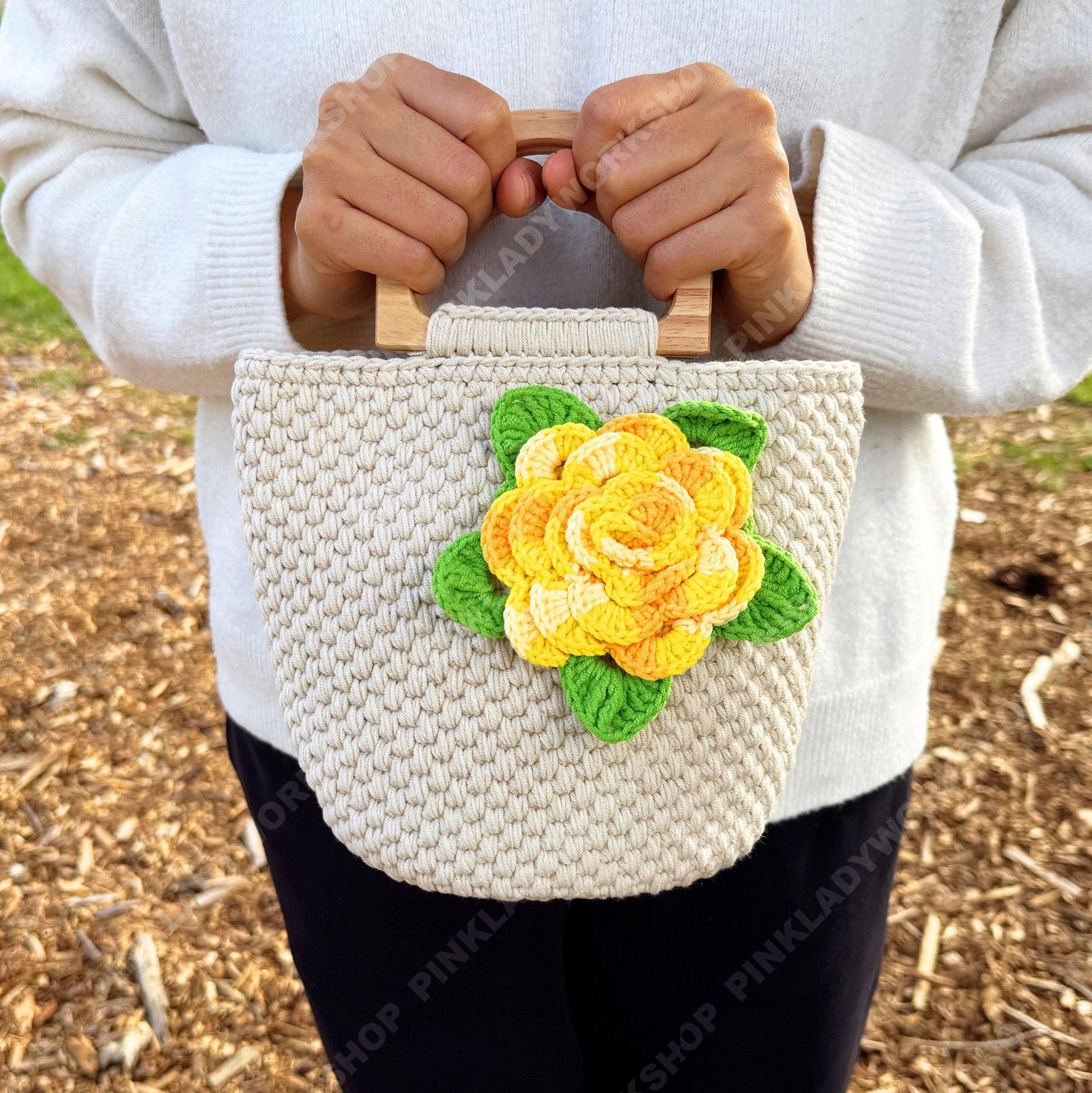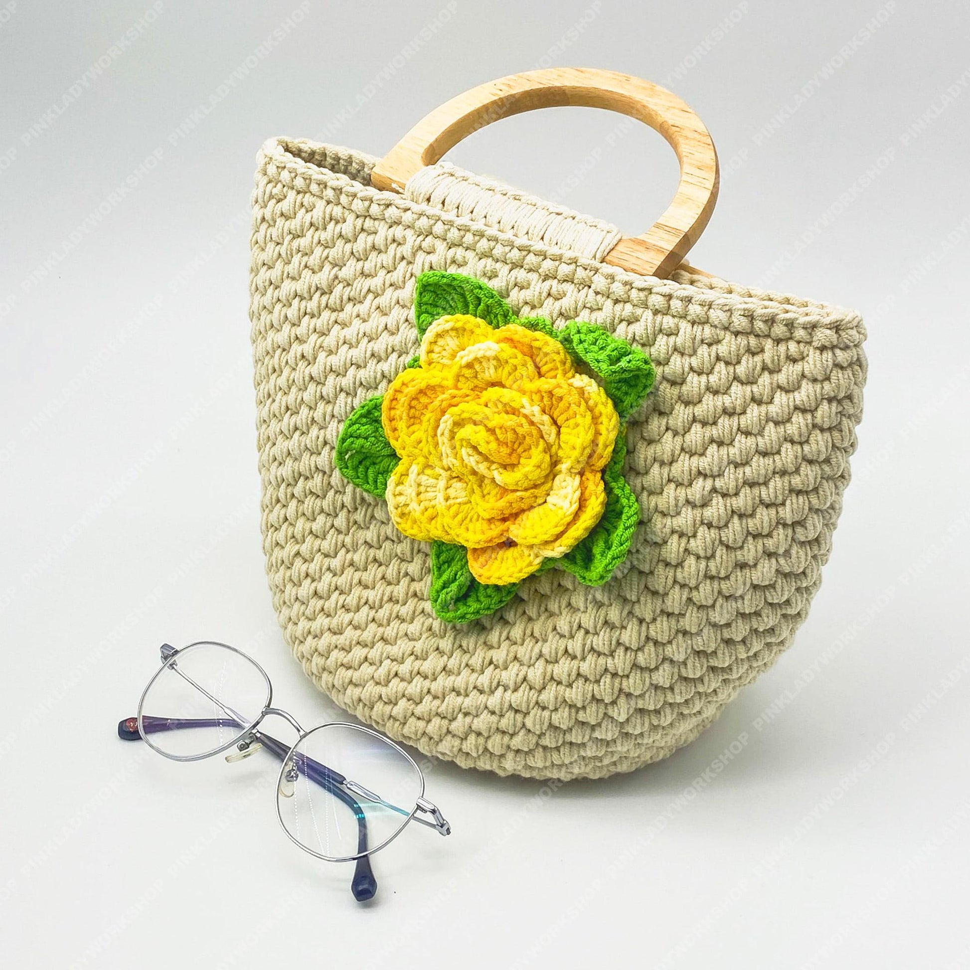 Pre-order Crochet Flower Handbag | Beige Yarn Tote with Yellow Rose