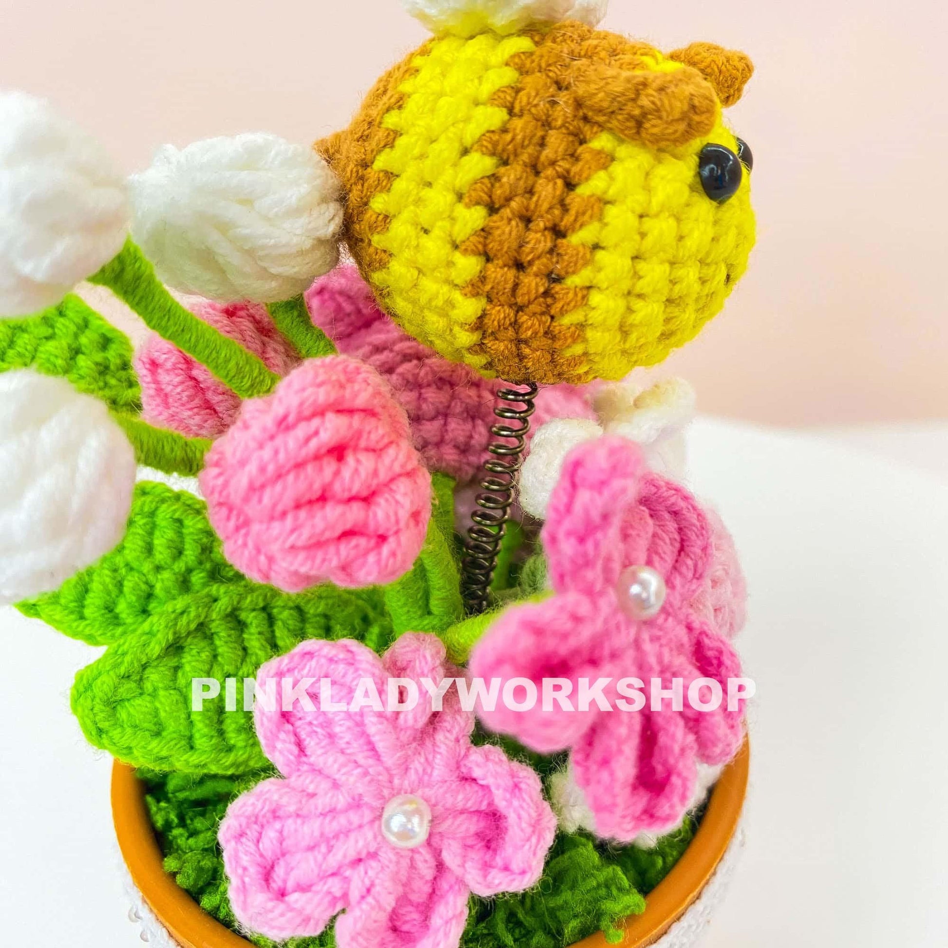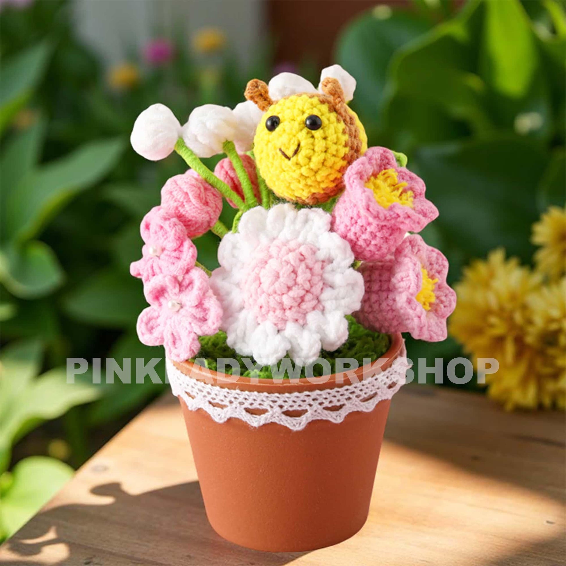 Handmade Crochet Bee Flower Pot: Pink Flowers, Spring Decor